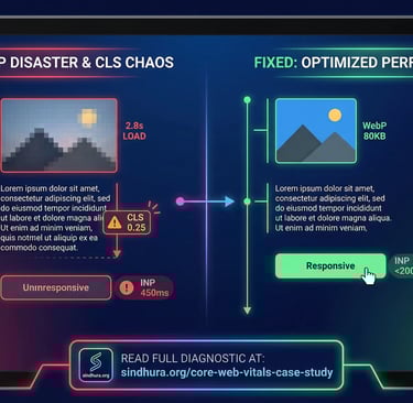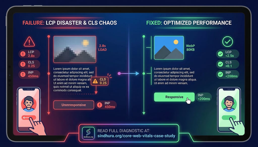 LCP > 2.5s: Hero images >2MB, render-blocking fonts, unoptimized code